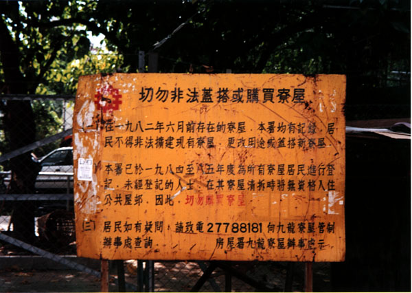 房 屋 署 公 布 於 村 口 貼 出 通 告 , 謂 草 廠 村 已 於 1998 年 七 月 開 始 清 拆 , 要 求 村 民 搬 遷 。 但 我 們 仍 可 清 楚 看 到 草 廠 村 居 民 沒 有 搬 遷 , 繼 續 與 政 府 對 峙 。